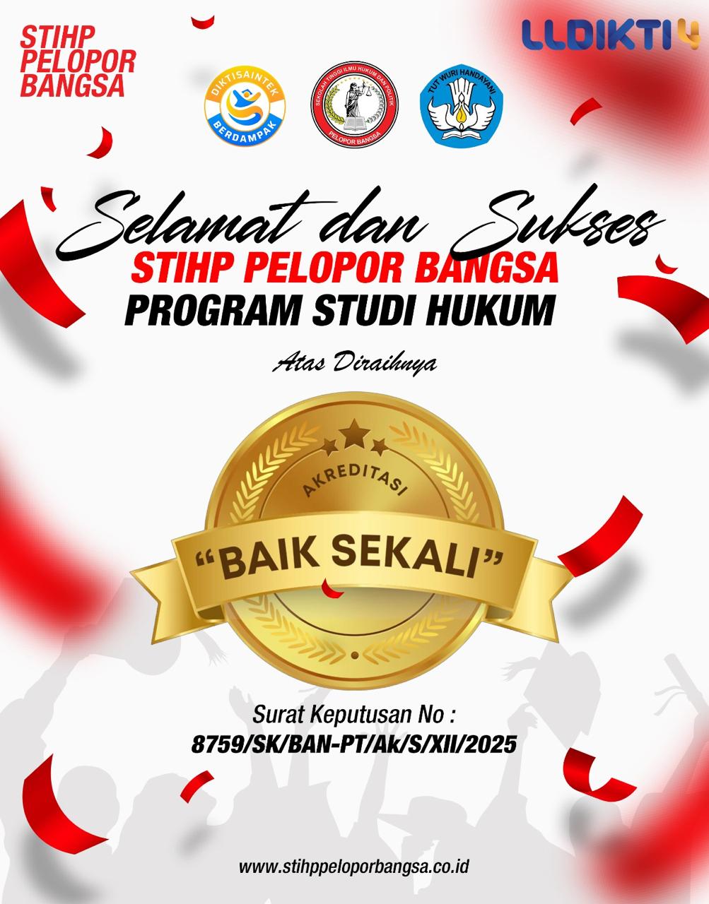 Sekolah Tinggi Ilmu Hukum dan Politik (STIHP) Pelopor Bangsa kembali mengukuhkan eksistensinya di dunia pendidikan tinggi tanah air. Berdasarkan hasil penilaian terbaru dari Badan Akreditasi Nasional Perguruan Tinggi (BAN-PT), kampus ini resmi menyandang peringkat akreditasi “Baik Sekali”.Pencapaian membanggakan ini tertuang dalam Surat Keputusan BAN-PT Nomor: 8759/SK/BAN-PT/Ak/S/XII/2025 yang ditetapkan pada tanggal 18 Desember 2025. Status ini menjadi bukti nyata peningkatan mutu akademik, sarana prasarana, serta tata kelola lembaga yang dijalankan oleh STIHP Pelopor Bangsa.