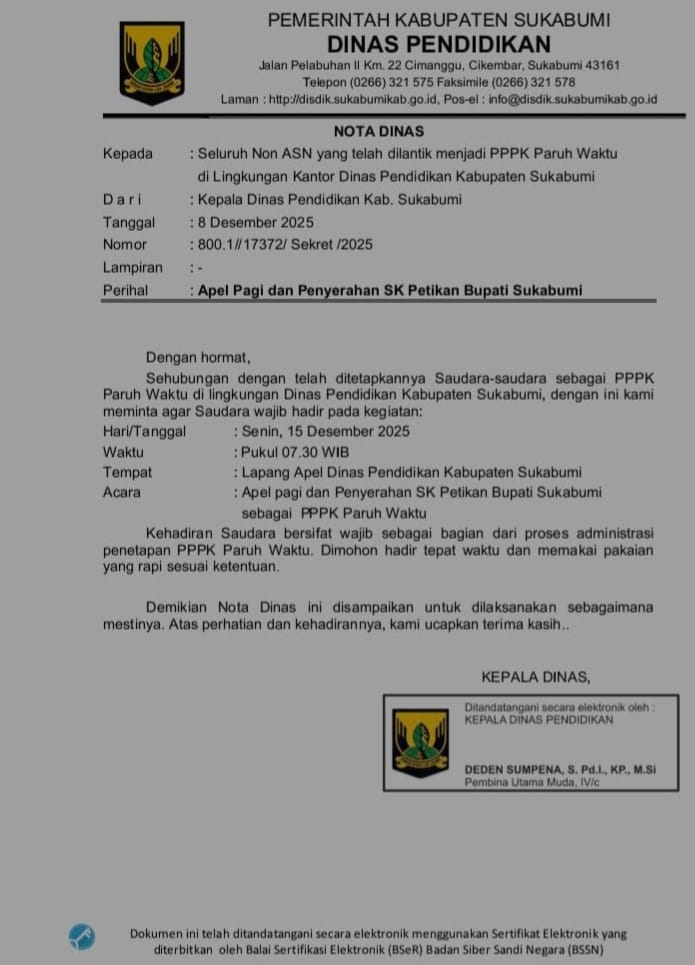 Nota Dinas Nomor 800.1/17372/Sekret/2025, tertanggal 8 Desember 2025, yang ditandatangani oleh Kepala Dinas Pendidikan, Deden Sumpena, S. Pd.I., KP., M.Si, menekankan agar kehadiran para PPPK bersifat wajib.