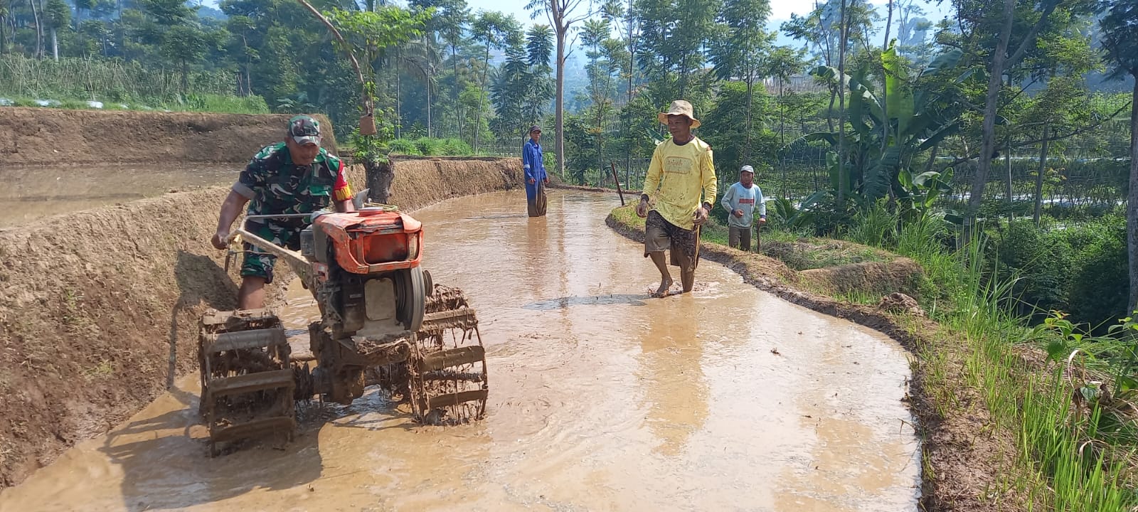 Sertu A.Awaludin menyampaikan membajak sawah adalah suatu kegiatan yang dilakukan petani untuk menggemburkan lahan persawahan sebelum masa tanam, seperti yang telah dilakukan Babinsa saat ini, dengan cekatan turun kesawah guna membantu petani membajak sawah .