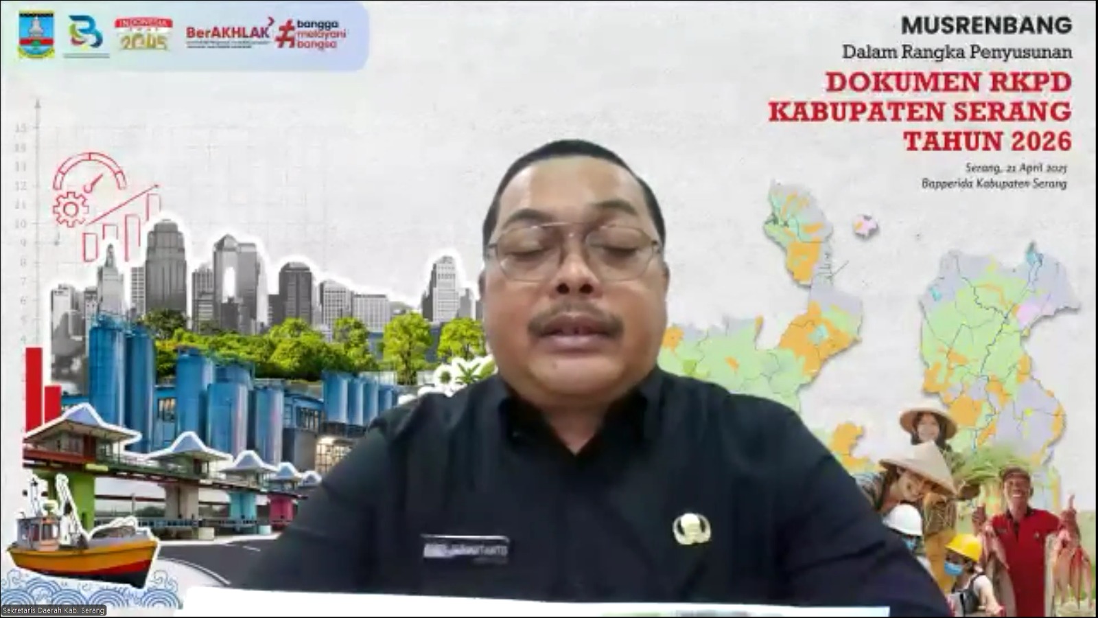 Penjabat Sekretaris Daerah (Pj Sekda) Kabupaten Serang, Rudy Suhartanto, membuka Musyawarah Perencanaan Pembangunan (Musrenbang) Rencana Kerja Pemerintah Daerah (RKPD) Kabupaten Serang tahun 2026 pada Senin, 21 April 2025 secara daring di Ruang Rapat Bapperida. Musrenbang dimaksudkan untuk membangun sinergitas bagi seluruh pemangku kepentingan dalam proses pembangunan Kabupaten Serang Tahun 2026.