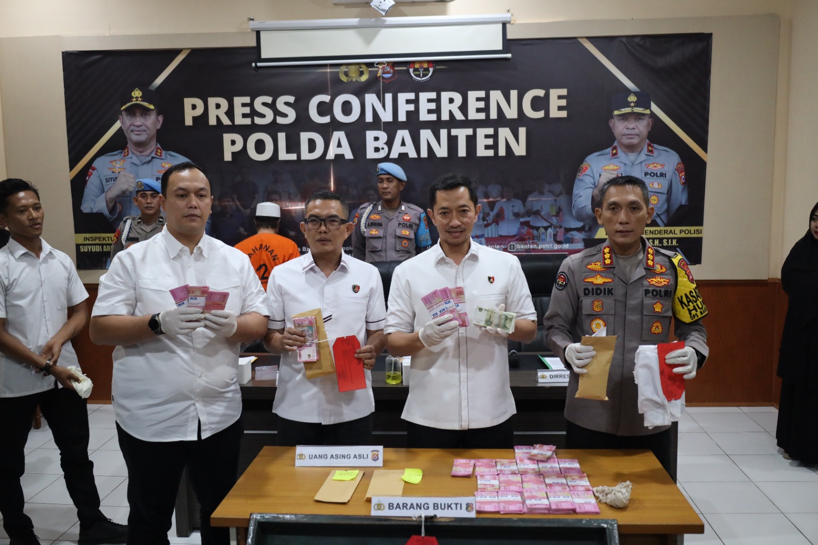 Kabid Humas Polda Banten menjelaskan kegiatan tersebut. “Hari ini kita melaksanakan ungkap kasus yang berhasil dilakukan oleh Subdit 3 Jatanras Ditreskrimum Polda Banten berhasil mengamankan pelaku Peredaran Uang Palsu diwilayah hukum Polda Banten,” jelasnya.