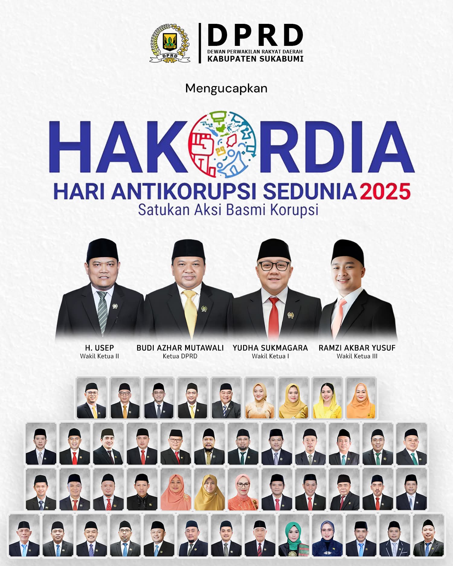 Mengusung tema nasional “𝐒𝐚𝐭𝐮𝐤𝐚𝐧 𝐀𝐤𝐬𝐢 𝐁𝐚𝐬𝐦𝐢 𝐊𝐨𝐫𝐮𝐩𝐬𝐢”, DPRD Kabupaten Sukabumi mengajak seluruh elemen masyarakat, aparatur sipil negara, dan pemangku kepentingan untuk: