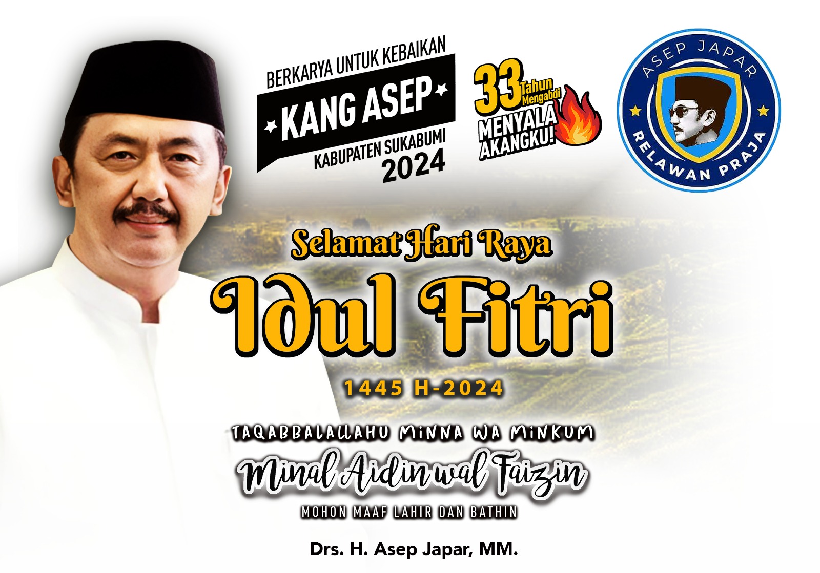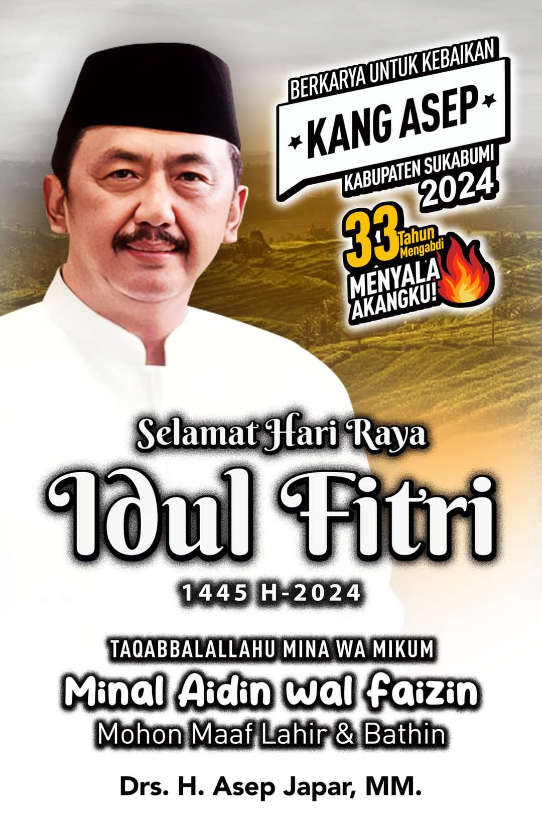 Sukabumi, Jawa Barat – Drs. H. Asep Japar, MM, Bakal Calon Bupati Sukabumi 2024-2029, melalui siaran persnya, mengucapkan selamat Hari Raya Idul Fitri 1445 H kepada seluruh masyarakat Kabupaten Sukabumi. (5/4)