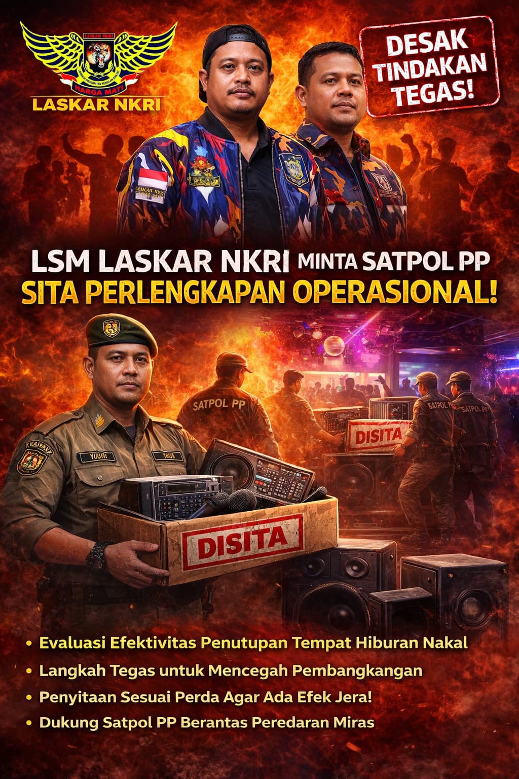 LSM Laskar NKRI secara tegas mendorong Satpol PP Kota Serang untuk tidak hanya melakukan penertiban administratif, tetapi juga mengambil langkah lebih tegas berupa penyitaan terhadap perlengkapan operasional THM yang terbukti melanggar.