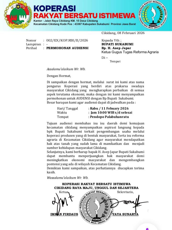 SUKABUMI – Pengurus Koperasi Rakyat Bersatu Istimewa (KORBI) secara resmi melayangkan surat permohonan audiensi kepada Bupati Sukabumi, H. Asep Japar, pada Minggu (8/2/2026).