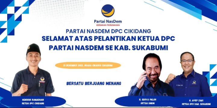 SUKABUMI – Ketua Forum Kidang Raya Bersatu, Rijwan Abdurahman, menyampaikan ucapan selamat dan sukses atas dilantiknya Hendrik Ramadhan sebagai Ketua Dewan Pimpinan Cabang (DPC) Partai NasDem Kecamatan Cikidang. Pelantikan ini merupakan bagian dari rangkaian pengukuhan Ketua DPC Partai NasDem se-Kabupaten Sukabumi yang dilaksanakan pada Minggu, 21 Desember 2025.