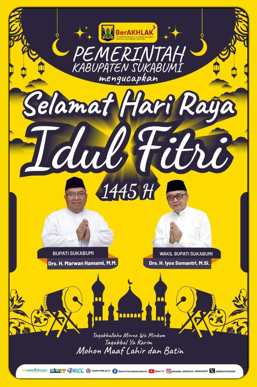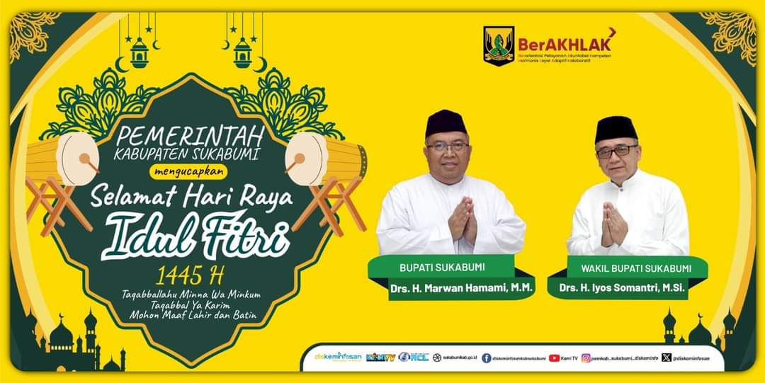 Sukabumi, 5 April 2024 – Segenap jajaran Pemerintahan Kabupaten Sukabumi mengucapkan selamat Hari Raya Idul Fitri 1445 Hijriah/2024 Masehi kepada seluruh umat Islam di Kabupaten Sukabumi.