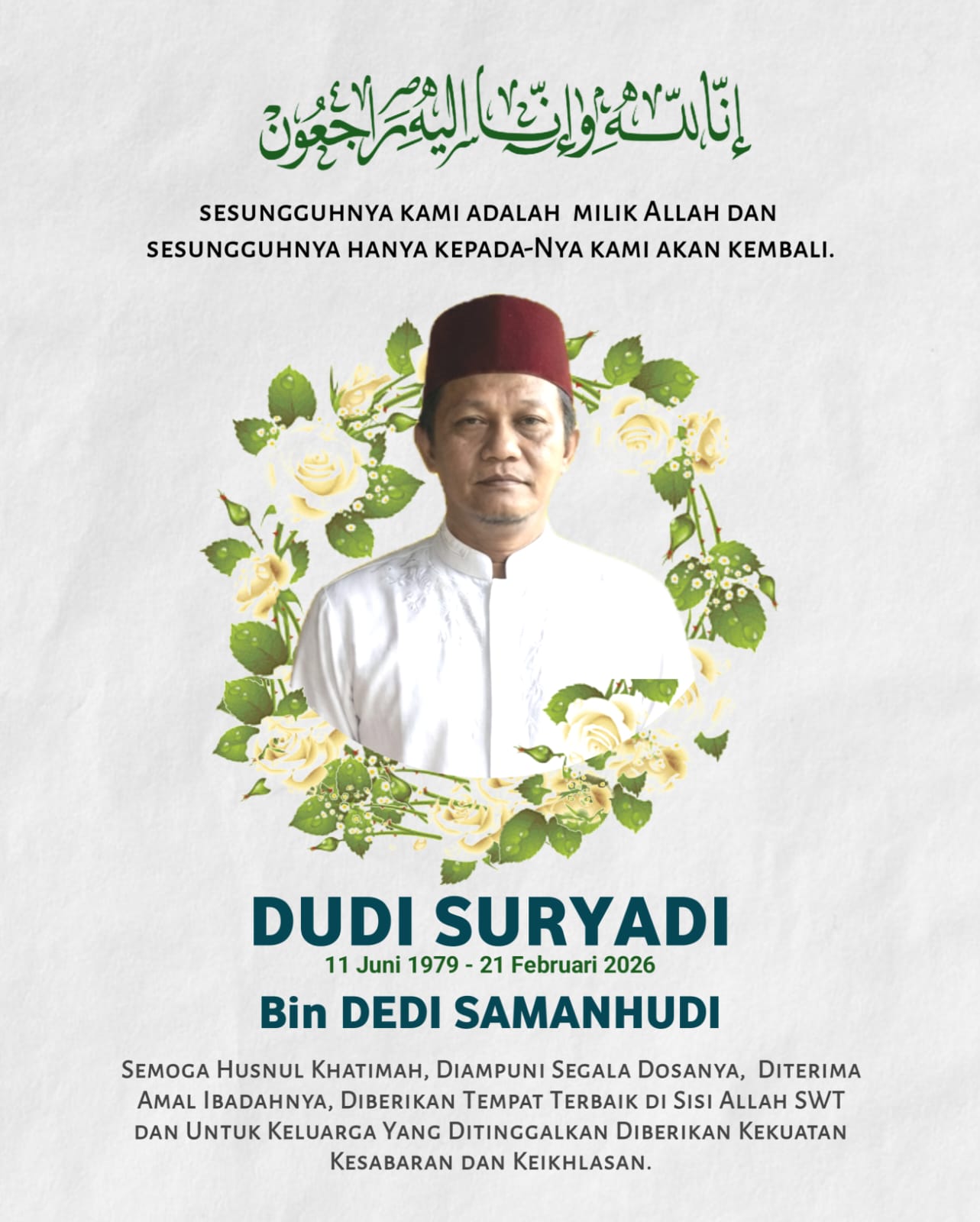 Innalillahi wa inna ilaihi roji’un. Telah berpulang ke rahmatullah Dudi Suryadi bin Dedi Samanhudi pada Sabtu, 21 Februari 2026.
