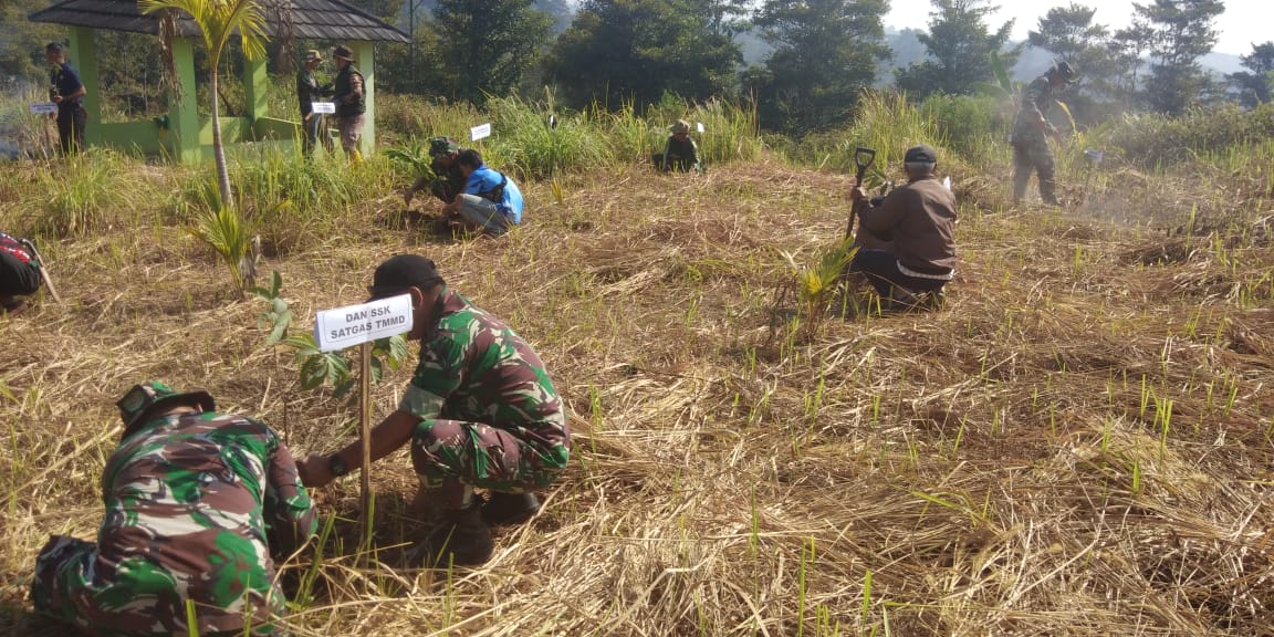Satgas TMMD dipimpin Pasiterdim Kapten Inf Herman Harkad melaksanakan penanaman pohon disekitar Kp. Coblongan Cipeutir Desa Cicareuh Kec. Cikidang. Minggu (18/05/2024).