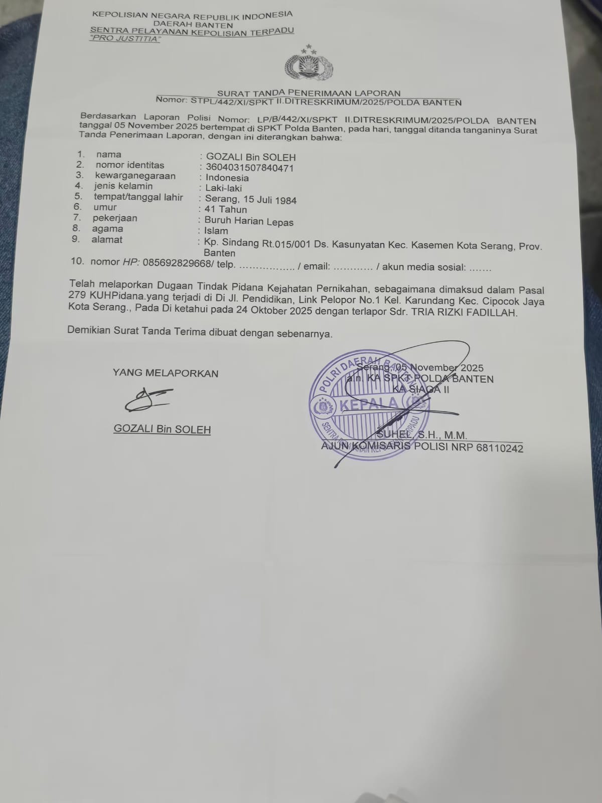 Seorang suami inisial G laki laki asal kasemen kota serang melaporkan istri ke polda banten karena istrinya inisial TRF asal padang yang di nikahinya 2018 silam sering melakukan perselingkuhan saat suami bekerja di luar kota serang yang menyebabkan istri berselingkuh.