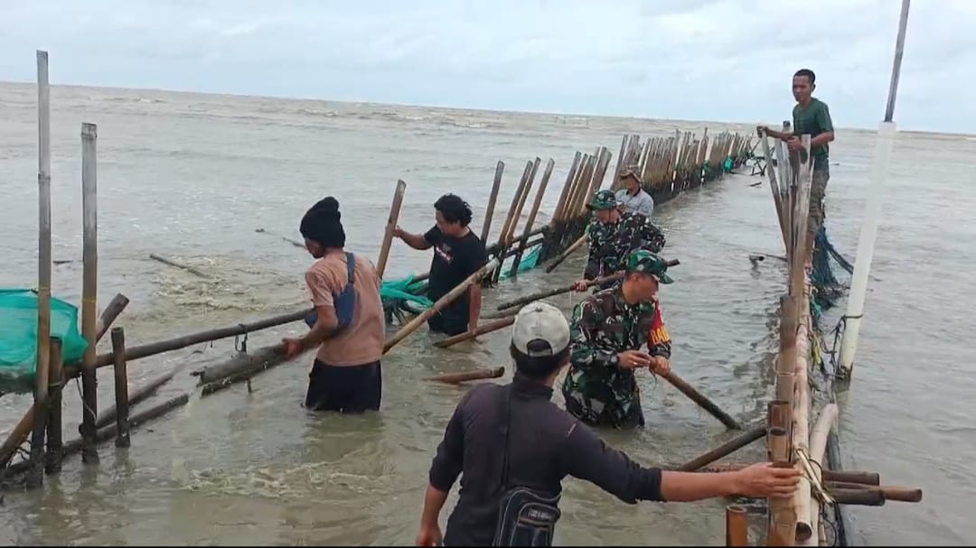 TNI Bersama Masyarakat Nelayan Bahu Membahu Mencabut Dan Membersihkan Pagar Bambu Yang Tidak Berijin.